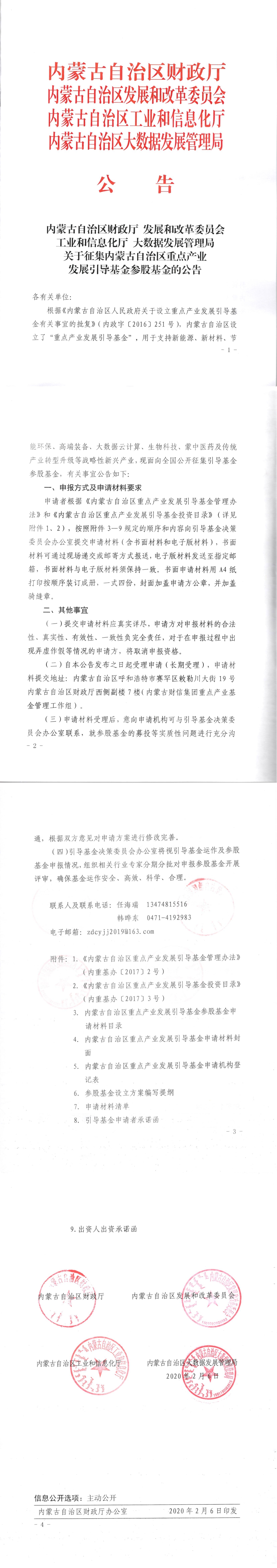 內(nèi)蒙古自治區(qū)財政廳 發(fā)展和改革委員會 經(jīng)濟(jì)和信息化廳 大數(shù)據(jù)發(fā)展管理局 關(guān)于征集內(nèi)蒙古自治區(qū)重點(diǎn)產(chǎn)業(yè)發(fā)展引導(dǎo)基金參股基金的公告