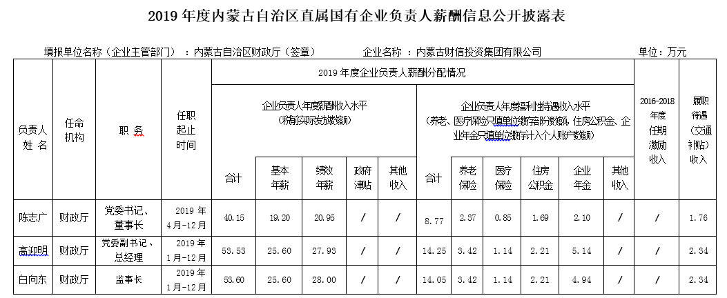 2019年度內(nèi)蒙古自治區(qū)直屬國有企業(yè)負責人薪酬信息公開披露表